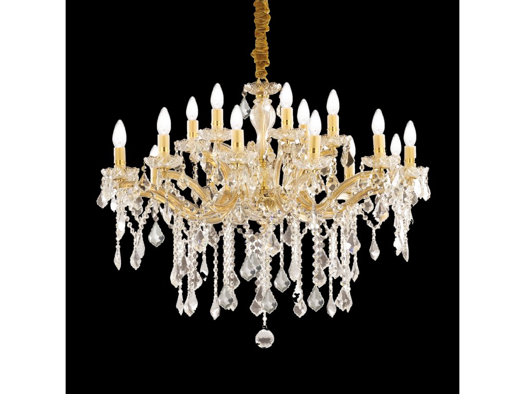 Ideal Lux FLORIAN – zlatý křišťálový lustr 18x E14Závěsný křišťálový lustr Ideal Lux FLORIAN je nádherné designové svítidlo v luxusním zlatém provedení, vyrobené renomovanou italskou značkou Ideal Lux. Je vybaven osmnácti paticemi E14 a je ideální pro použití s LED žárovkami. Kombinuje klasickou eleganci s leskem křišťálů a je stvořen pro reprezentativní prostory, jako jsou: