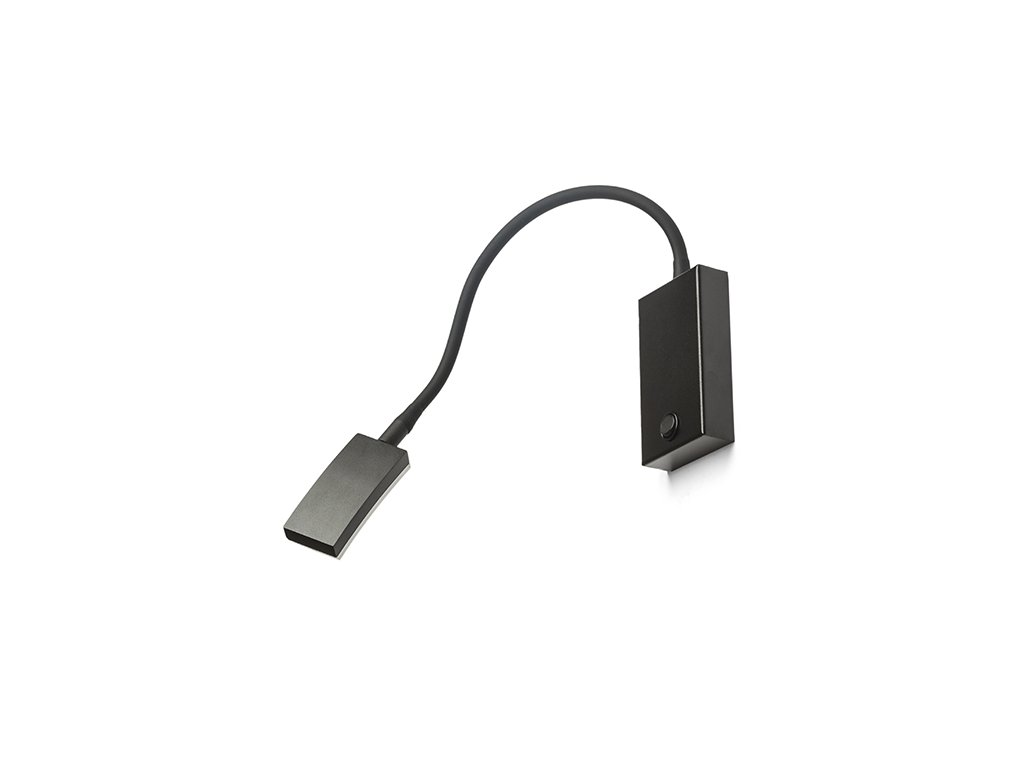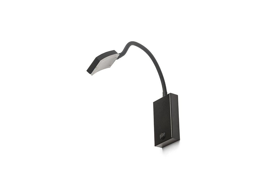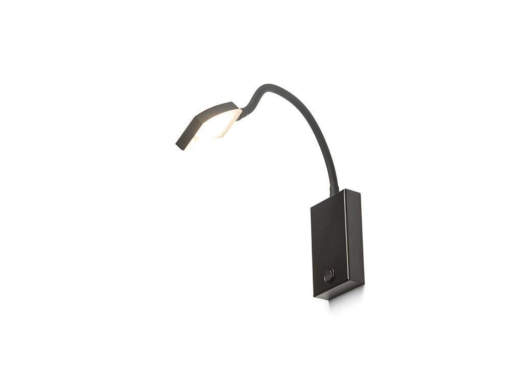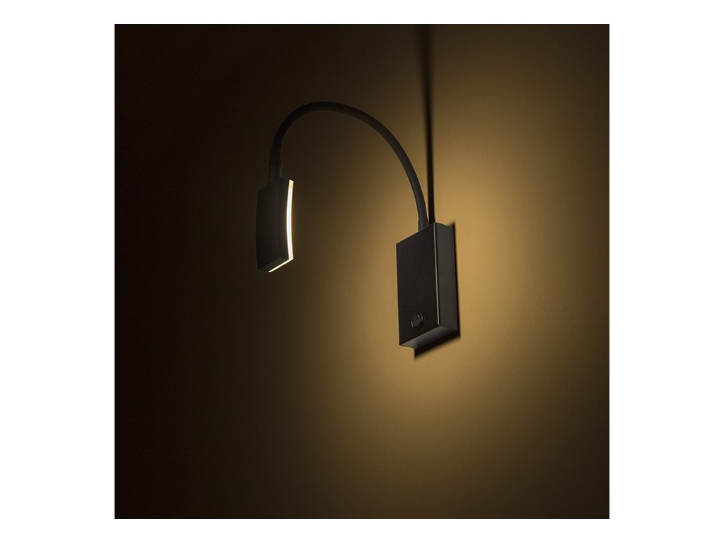 Nástěnná LED lampička na ohebném krku s vypínačem na základně a obdélníkovou hlavou pro široký rozptyl svícení.Doplňkové parametry
