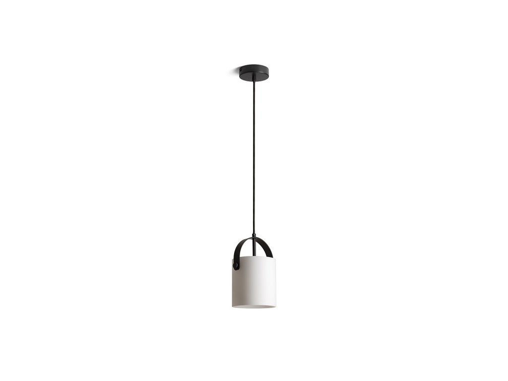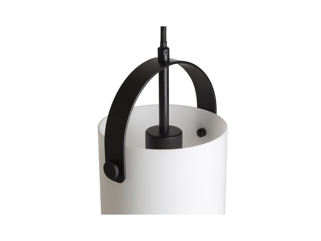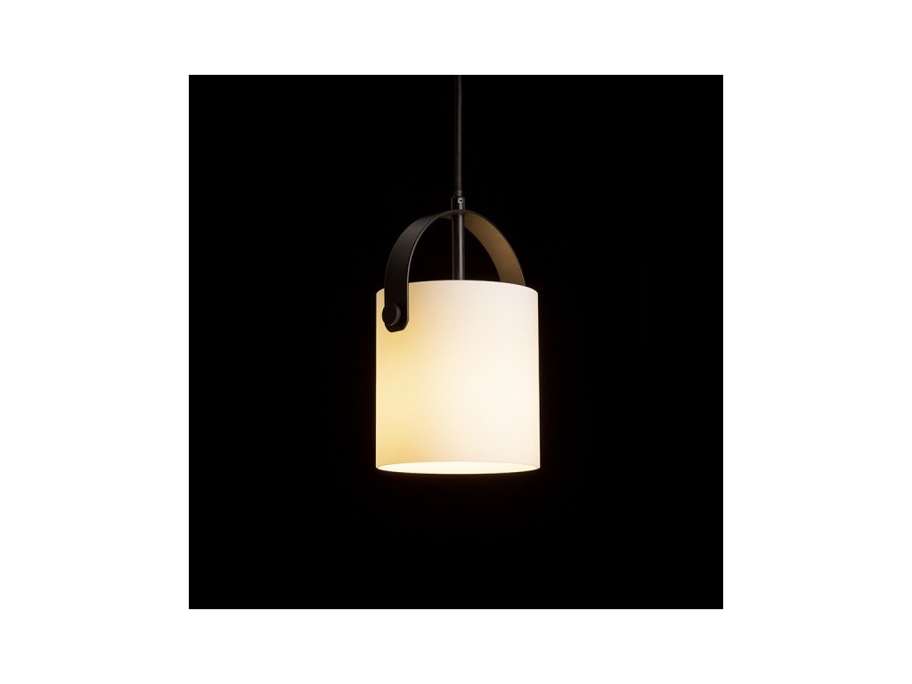 Závěsné designové svítidlo s opálovým válcovým sklem. Lakované kovové prvky, černý textilní kabel.Doplňkové parametry