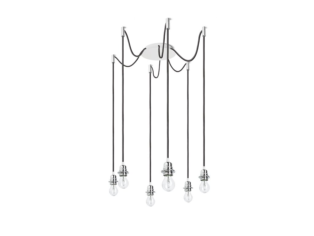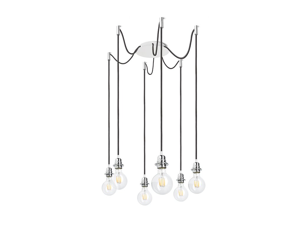 Závěsné svítidlo s centrální stropní základnou a šesti jednotlivými textilními závěsy s kovovou paticí E27, pro použití s dekorativními žárovkami nebo vhodnými textilními stínidly. Závěsy jsou opatřeny stropními chromovými úchyty, které lze umístit do individuálně zvolné vzdálenosti od základny. Celková délka kabelu 3 m.Doplňkové parametry