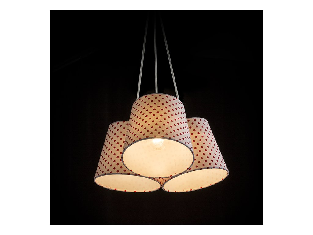 Zavěšená tři textilní stínidla z jedné základny na tři žárovky s paticí E14.Doplňkové parametry