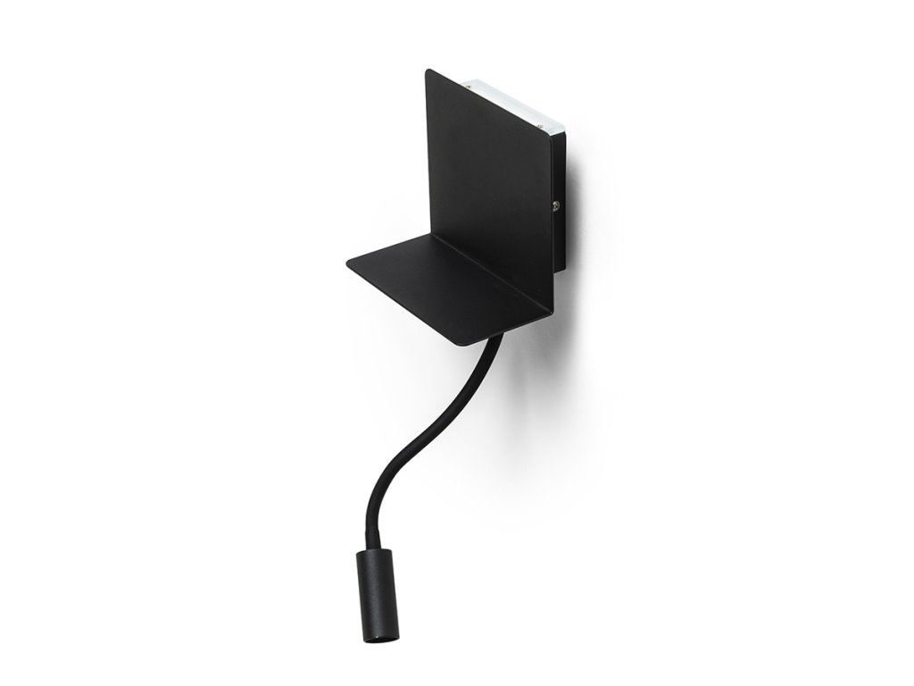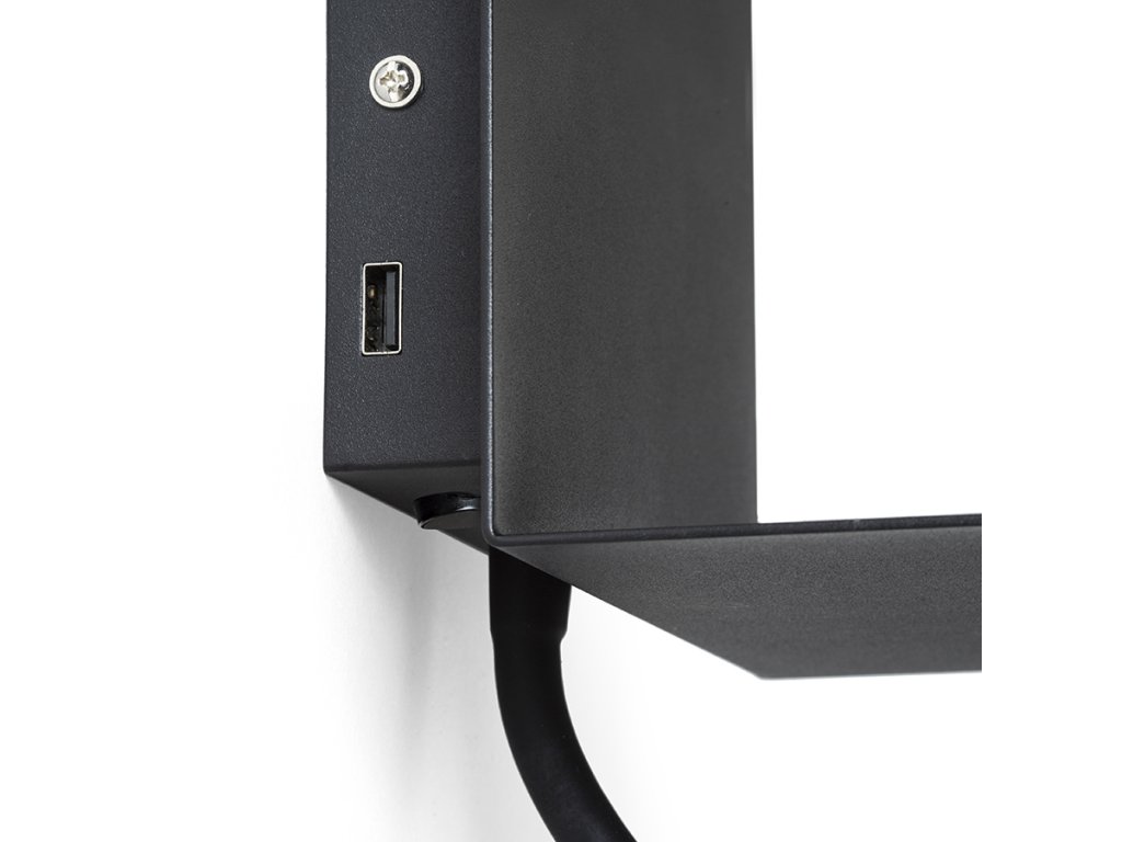Nástěnné LED svítidlo s poličkou pro odkládání telefonu a integrovaným USB portem. LED bodovka na ohebném krku a nepřímé osvětlení jsou ovládány samostatně pomocí dvou vypínačů.Doplňkové parametry