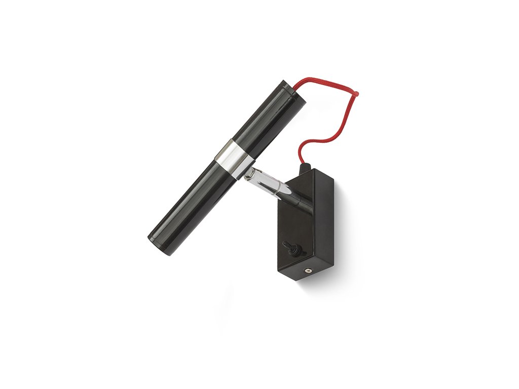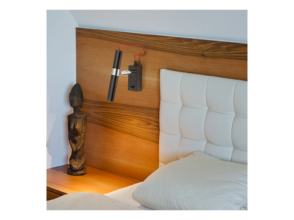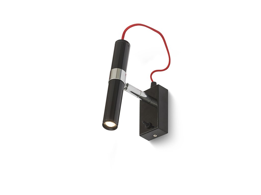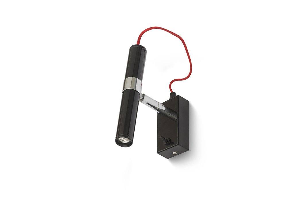 Designová chromová nástěnná lampa s černým LED reflektorem a červeným textilním kabelem.Doplňkové parametry
