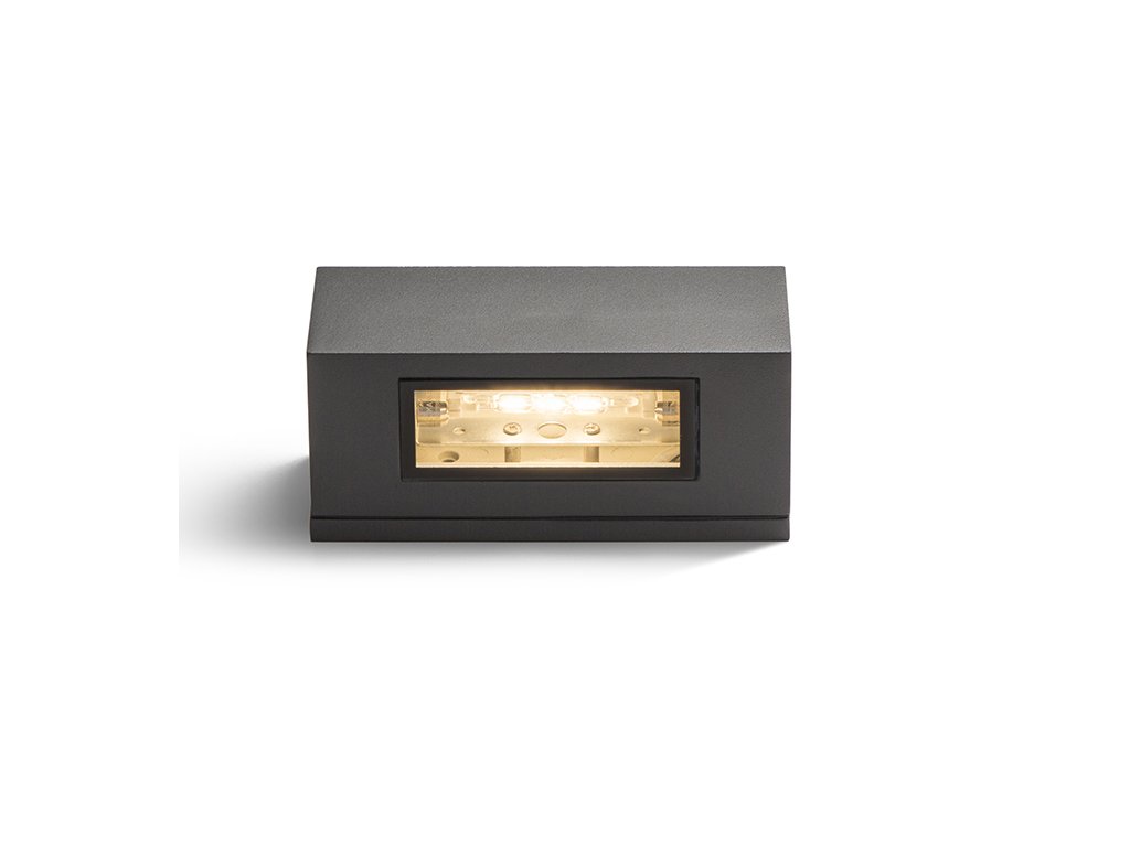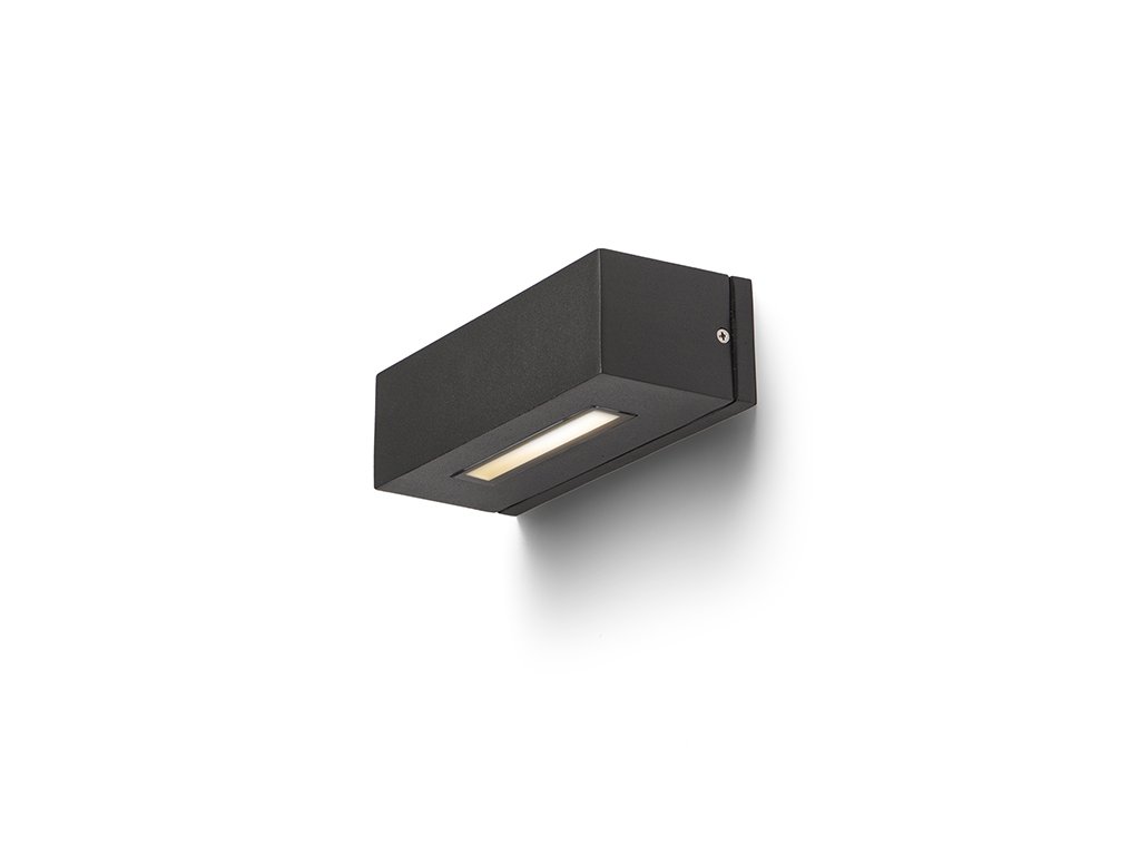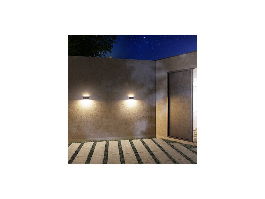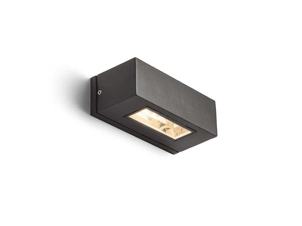 Nástěnné venkovní svítidlo UP/DOWN. Jedna strana svítidla je osazena čirým krycím sklem s černým rámečkem. Druhá strana svítidla je osazena užším matným sklem s černým rámečkem.Doplňkové parametry