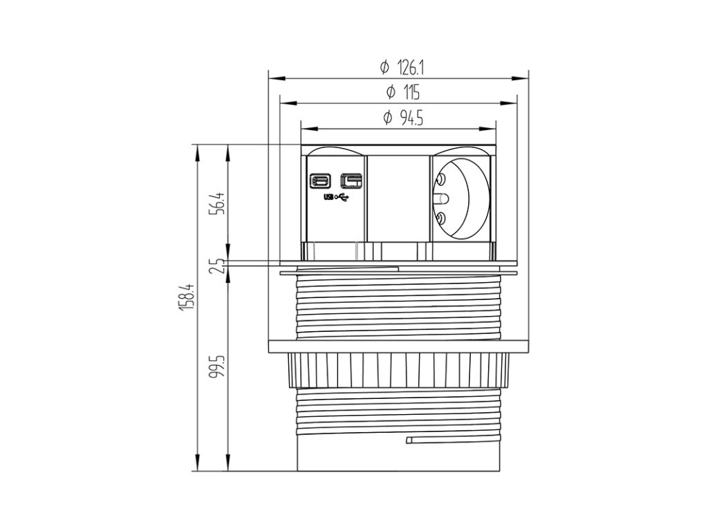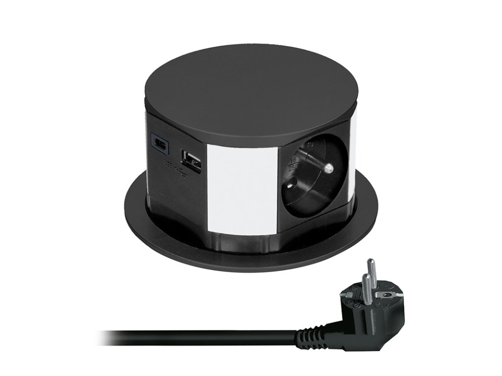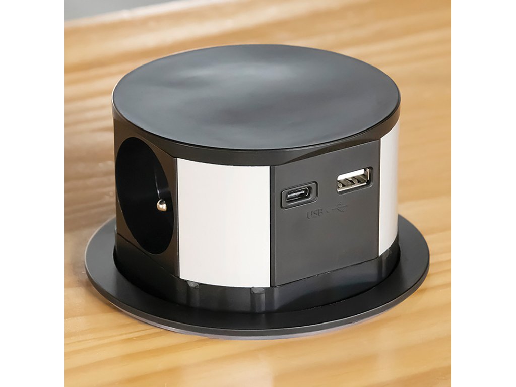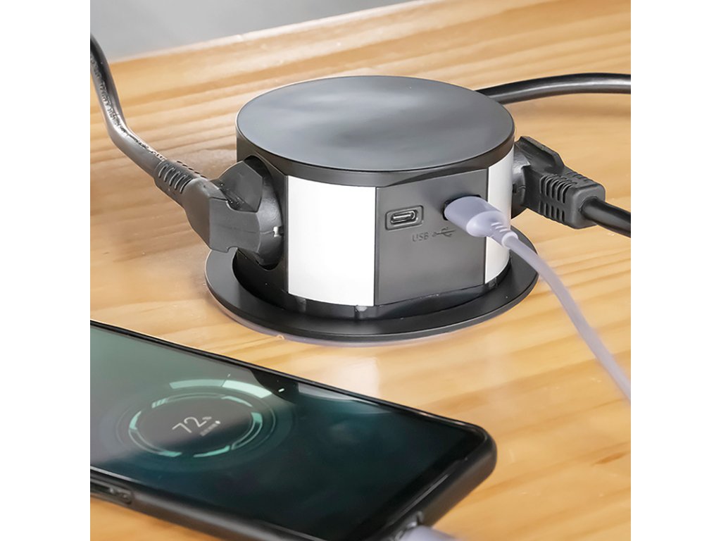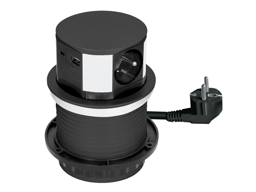 Výsuvný blok zásuvek se třemi 230V zásuvkami a integrovanou USB nabíječkou přináší praktické a moderní řešení napájení přímo do pracovní plochy. Kruhové tělo umožňuje pohodlný přístup ze všech stran, ideální pro pracovní stoly, kuchyňské linky nebo konferenční místnosti. Výsuvný mechanismus chrání zásuvky i nabíjecí porty před nečistotami a neruší celkový vzhled interiéru.