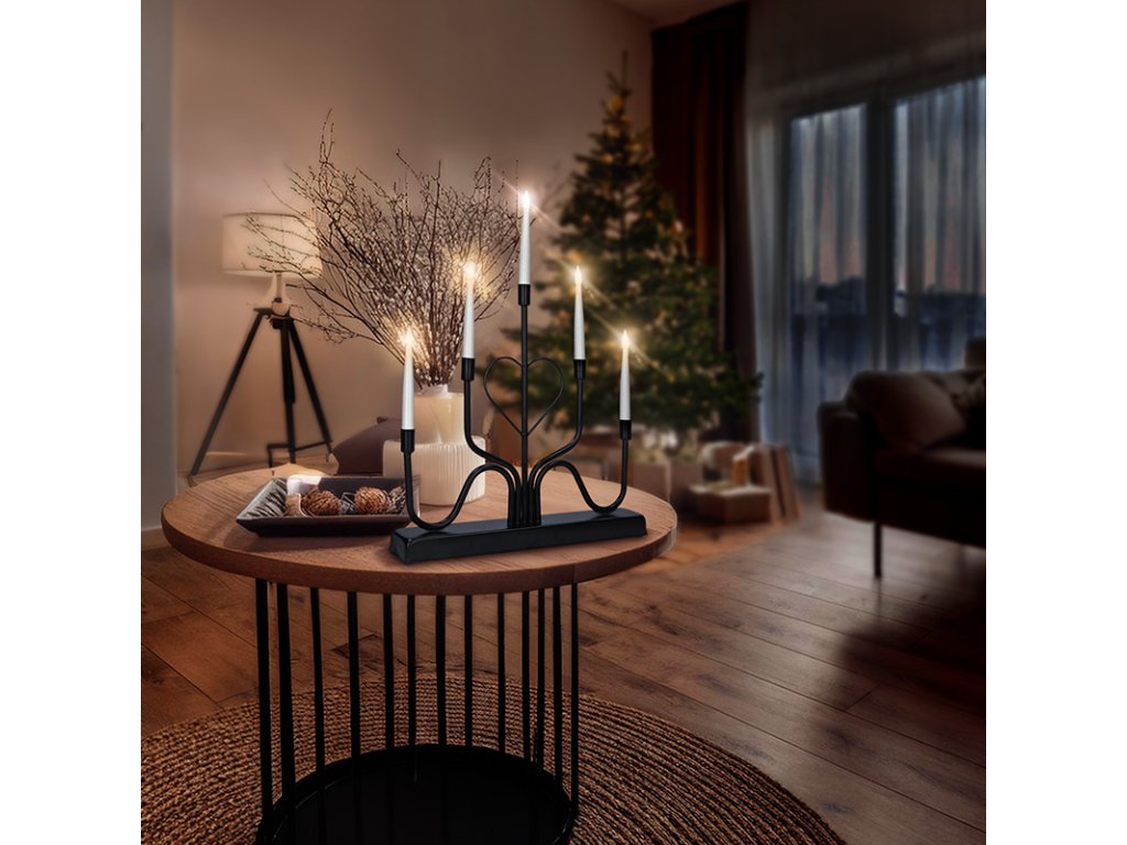 Moderní pětiramenný svícen v černé barvě je elegantní kombinací klasiky a současného designu. Každé z pěti ramen je osazeno LED diodou s teplým bílým světlem, které navozuje klidnou, sváteční atmosféru. Rozměry svícnu jsou 32 × 42 cm, díky čemuž je ideální pro umístění na stůl, parapet nebo komodu.