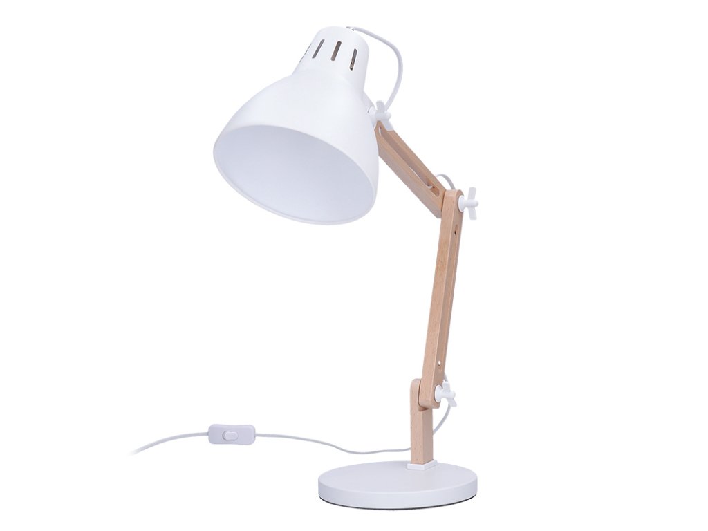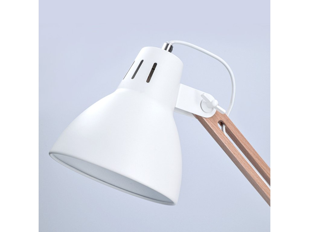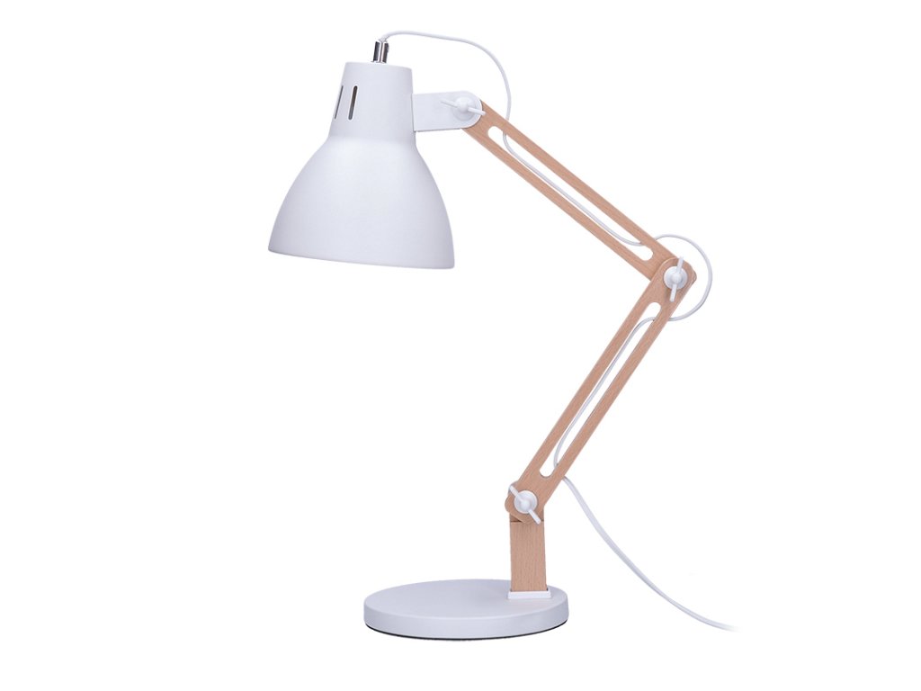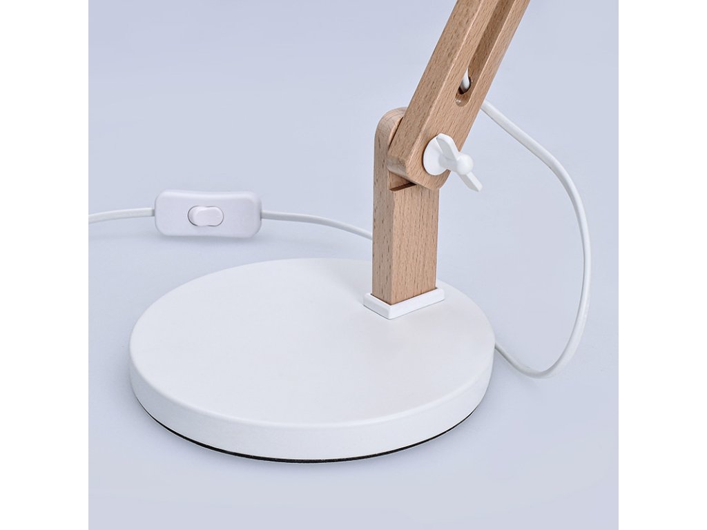 Ramena jsou plně nastavitelná – celková délka 10 + 25 + 25 cm – a umožňují přesné nasměrování světla. Průměr kovové základny je 17 cm, rozměr stínidla 15,5 x 16,5 cm. Díky přívodnímu kabelu o délce 150 cm s vypínačem je manipulace s lampou snadná. Ideální jako dekorativní i pracovní světlo. Barva: přírodní dřevo + matná bílá. Napětí: 230V.