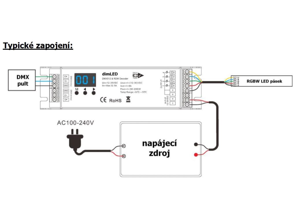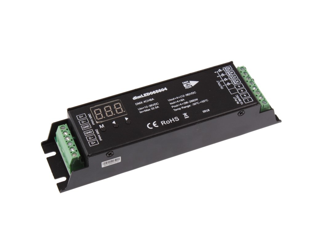 DMX 4CH8A dekodér je 4-kanálový převodník určený pro ovládání LED systémů se společnou anodou pomocí DMX konzole, mezi které patří například jednobarevné a RGB, RGBW pásky.