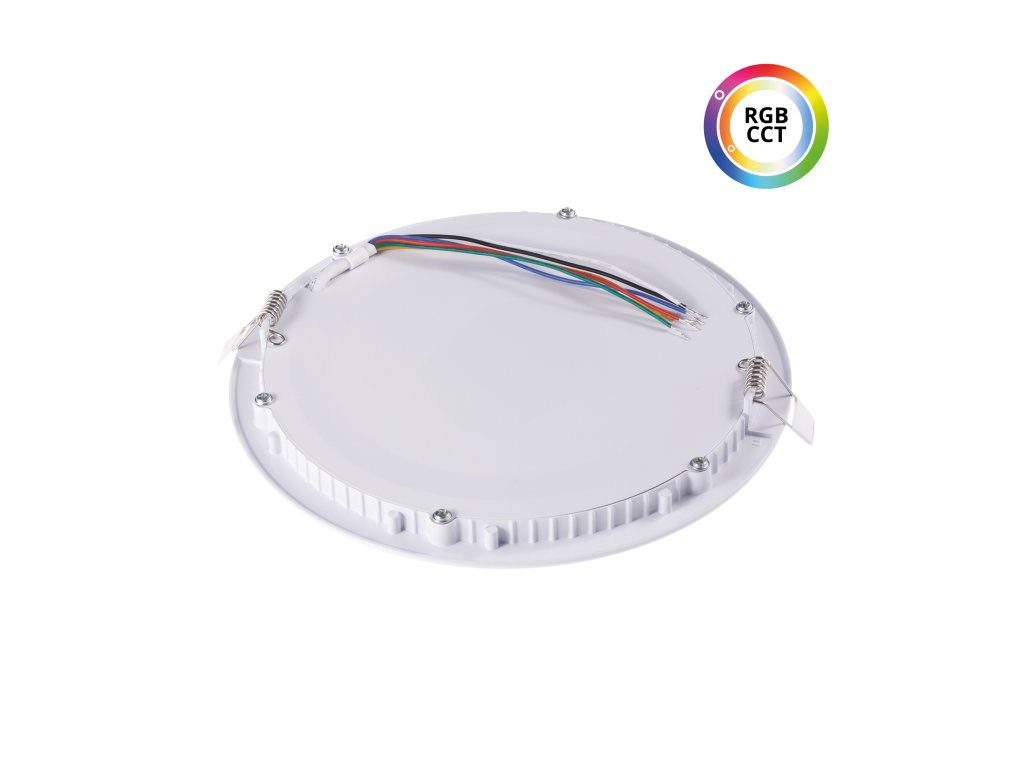 Vestavný kulatý bílý RGBCCT LED panel 24V 27W určený pro instalaci do podhledu. Díky bočnímu nasvětlování nejsou jednotlivé LEDky při rozsvícení viditelné a lze použít i ultratenký design. LED panel díky RGBCCT provedení Vám umožňuje nastavit barvu bílého světla v rozmezí od 2000K do 6000K a můžete nastavit bílé světlo od teplých žlutých odstínů bílé přes denní až po studené bílé světlo. Zároveň lze nastavit také barvy z RGB spektra (červená, zelená, modrá a jejich kombinace). Napětí 24V umožňuje tyto LED panely taktéž instalovat na místa, kde potřebujete nízké napětí. Zároveň 24V napětí je často využíváno v chytrých domácnostech jako je LOXONE či jiné obdobné systémy.